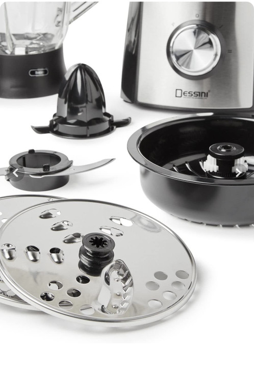 بهره می برد و موجب راحتی و سهولت در آشپزی می گردد. ظرفیت مناسب غذاساز، باعث می شود تا بتوان به صورت یکجا حجم بسیاری از مواد غذایی را در داخل آن ریخت و ظرف مدت کوتاهی انواع اسموتی ها، همبرگرهای خانگی، دسرها، سس ها و ... را، بدون دردسر و زحمت تهیه و ترکیب کرد. همچنین به کمک مخلوط کن عرضه شده، می توان انواع میوه ها را میکس و نوشیدنی های مختلفی را آماده سرو کرد. همانطور که گفته شد، به همراه غذاساز Dessini 9900 آسیاب و رنده با سه سایز متفاوت نیز ارائه گردیده که به لطف آنها می توان سیب زمینی و یا دیگر موادغذایی را به اشکال مختلف رنده نمود و از آشپزی لذت برد. دسینی (