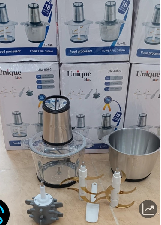 خردکم برقی یونیک مکس مدل UM-8003 با توان موتور 3800 وات یکی از قویترین خردکن های خانگی است که با دو تا کاسه استیل و پیرکس زیبایی را برای آشپزخانه به ارمغان میاورد و قادر به خرد کردن انواع سیفی جات، مرغ، گوشت و همچنین پوست کندن سیر می باشد. با استفاده از خردکن یونیک مکس از آشپزی راحت و آسان لذت ببرید3800