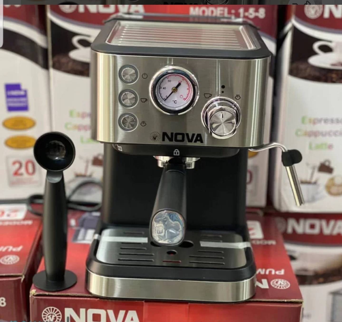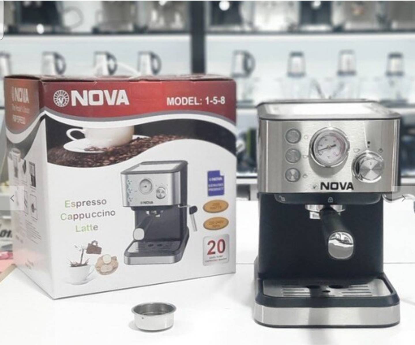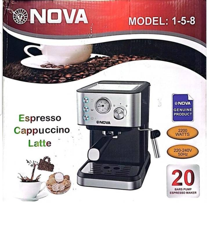 اسپرسوساز 8-5-1 نوا که طرح جدیدی از محصول 158 است.این دستگاه یکی از کارآمد ترین محصولات در بین لوازم خانگی است. اسپرسو ساز نوا 8-5-1 دارای 20 بار فشار بخار با توان قدرتی 2200 وات است. که این توان به خوبی می تواند برای شما در کمترین زمان قهوه، اسپرسو و هر نوشیدنی دیگه ای را آماده کند. اسپرسوساز ۱۵۸. بازه ولتاژ این اسپرسو ساز نوا بین 220 تا 240 ولت است. شما می توانید انواع نوشیدنی ها از جمله اسپرسو، کاپوچینو، لاته و غیره را به راحتی و به سرعت برای خود در خانه تهیه کنید. قیمت اسپرسوساز 8-5-1